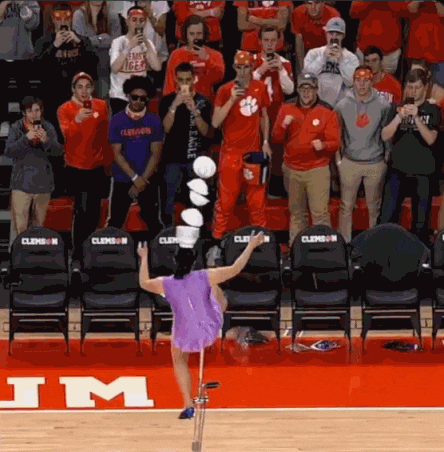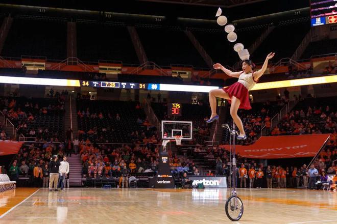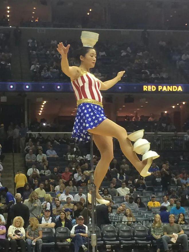 每次登臺之前,她會檢查她的獨輪車,這臺獨輪車有七尺(2米1)高,她簡單做一些伸展動作,然后站上去,深吸一口氣,集中精力,就像平日NBA日報宣報練習(xí)一樣,盡管她已經(jīng)爐火純青,但每次成功完成,她依然會和現(xiàn)場的球迷一樣,感覺很有成就感。