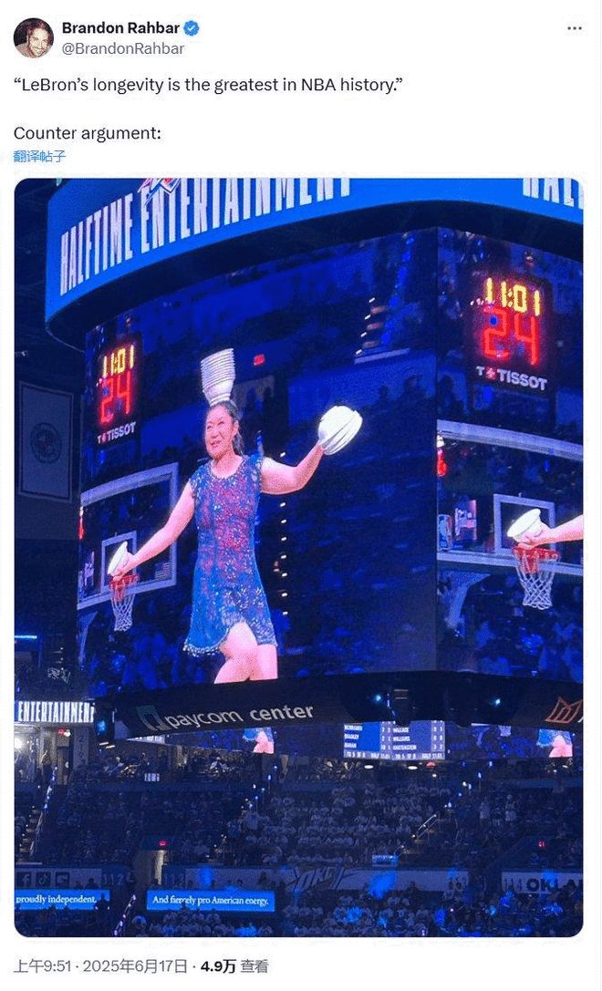 NBA總決賽第五場,雷霆主場Paycom中心,當(dāng)《大花轎》的背景音樂響起,一個熟悉的身影出現(xiàn)在中場表演之中。