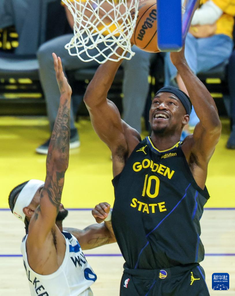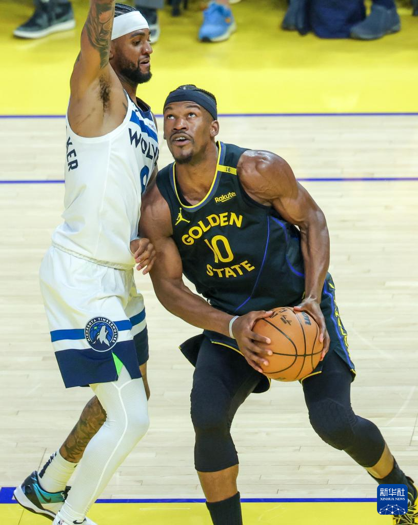 5月12日,勇士隊(duì)球員巴特勒(左)在比賽中進(jìn)攻。
