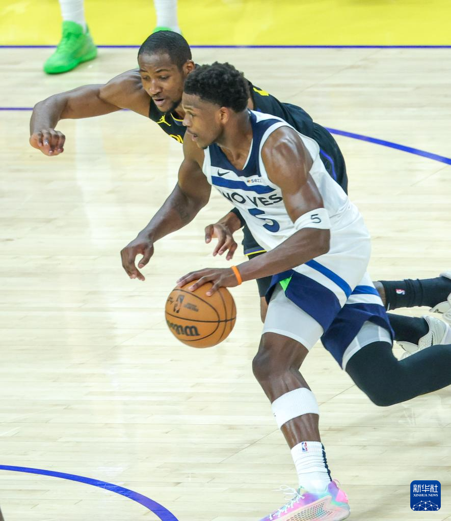 5月12日,森林狼隊(duì)球員愛德華茲(右)在比賽中進(jìn)攻。