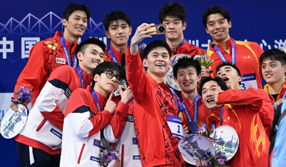 當(dāng)汪順、孫楊、潘展樂三代奧運冠軍與費立緯為浙江隊贏得男子4X200米自由泳接力冠軍,特別是當(dāng)孫楊和潘展樂第三、四棒交接的那一瞬間,全場歡呼如潮,宛如奏響“泳池歡樂頌”。
