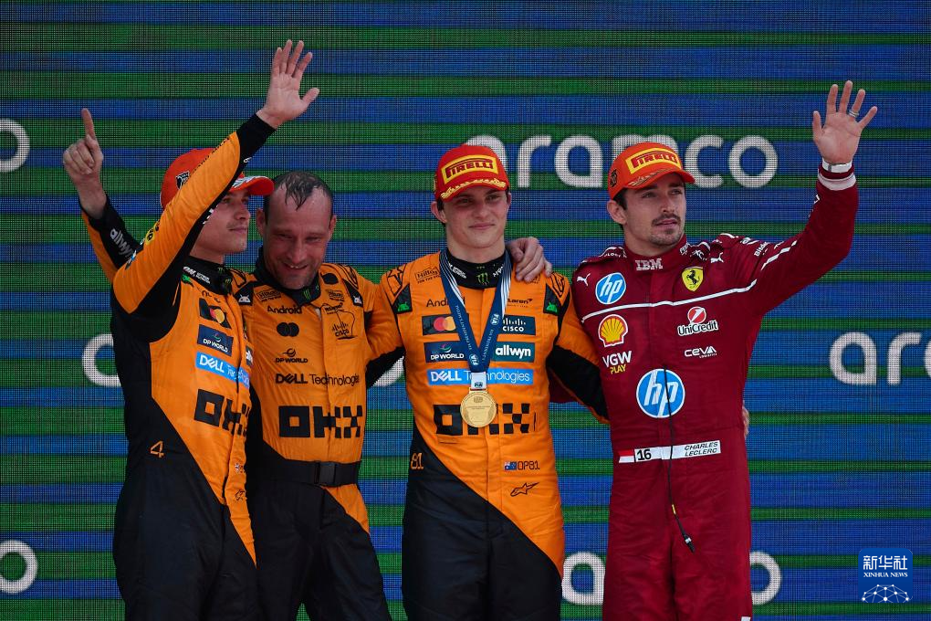 6月1日,冠軍邁凱倫車隊澳大利亞車手皮亞斯特里(右二)、亞軍邁凱倫車隊英國車手諾里斯(左一)和季軍法拉利車隊摩納哥車手勒克萊爾(右一)在頒獎儀式上。