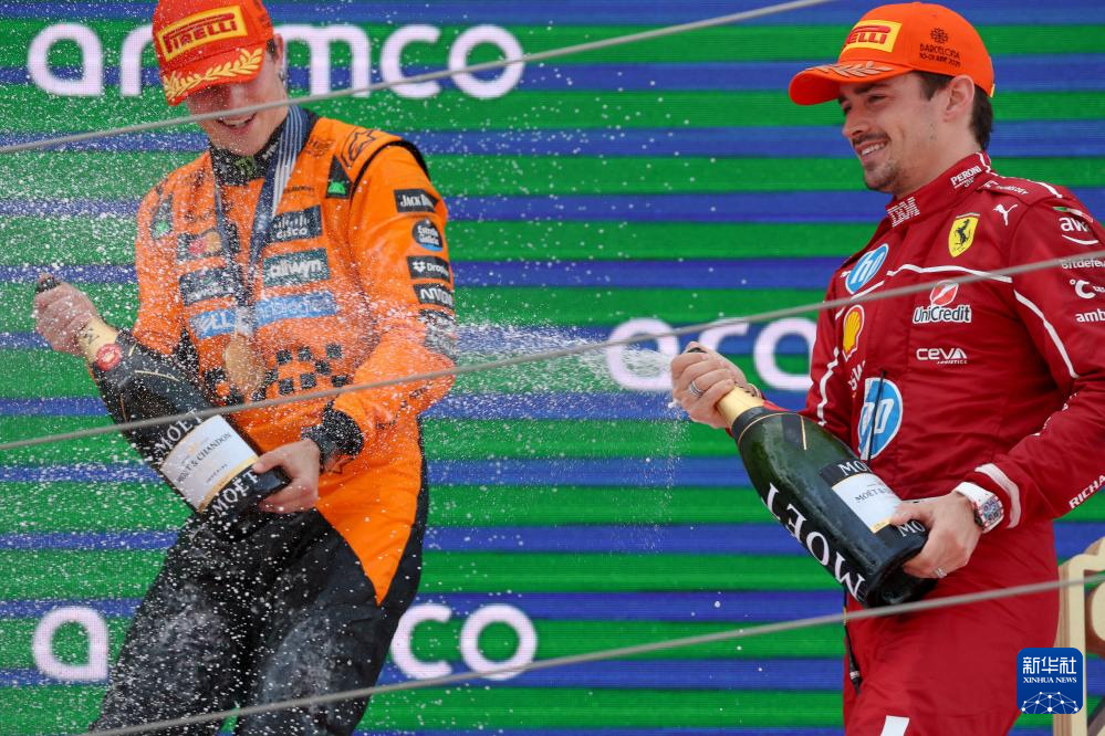 6月1日,冠軍邁凱倫車隊澳大利亞車手皮亞斯特里(左)與季軍法拉利車隊摩納哥車手勒克萊爾在頒獎儀式上噴灑香檳慶祝。