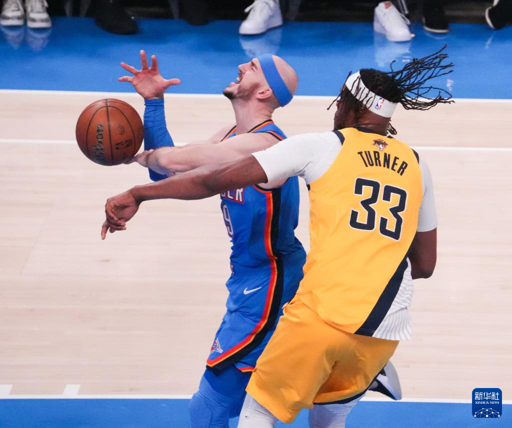 6月8日,雷霆隊球員卡魯索(左)與步行者隊球員特納在比賽中拼搶。