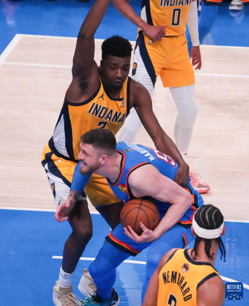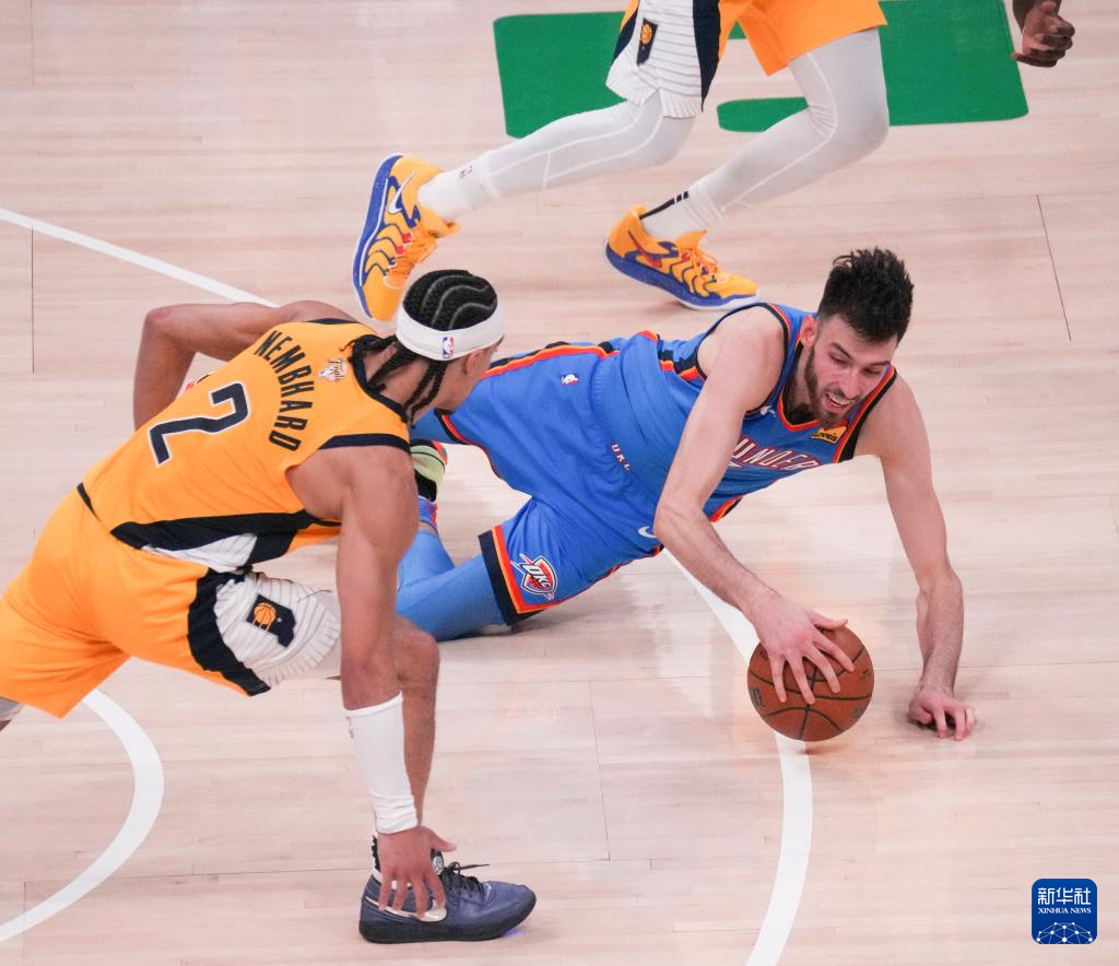 6月8日,雷霆隊球員卡魯索(右)在比賽中防守步行者隊球員西亞卡姆。
