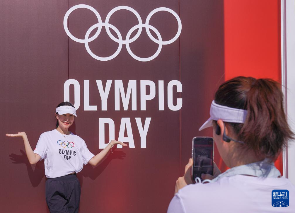6月21日,在北京奧林匹克中心區(qū),參加奧林匹克日活動(dòng)的運(yùn)動(dòng)愛(ài)好者在現(xiàn)場(chǎng)拍照留念。