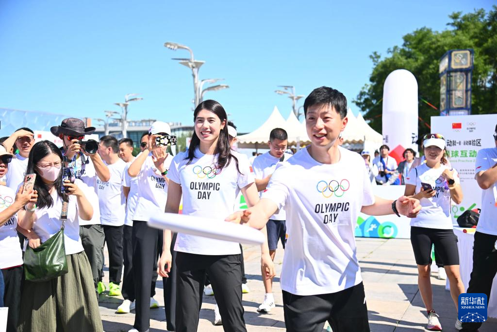 6月21日,在北京奧林匹克中心,游泳運(yùn)動(dòng)員張雨霏(前左)和乒乓球運(yùn)動(dòng)員馬龍(前右)在奧林匹克日活動(dòng)中。