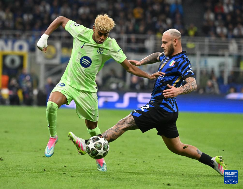 5月6日,國(guó)際米蘭隊(duì)球員迪馬爾科(右)與巴塞羅那隊(duì)球員亞馬爾在比賽中拼搶。