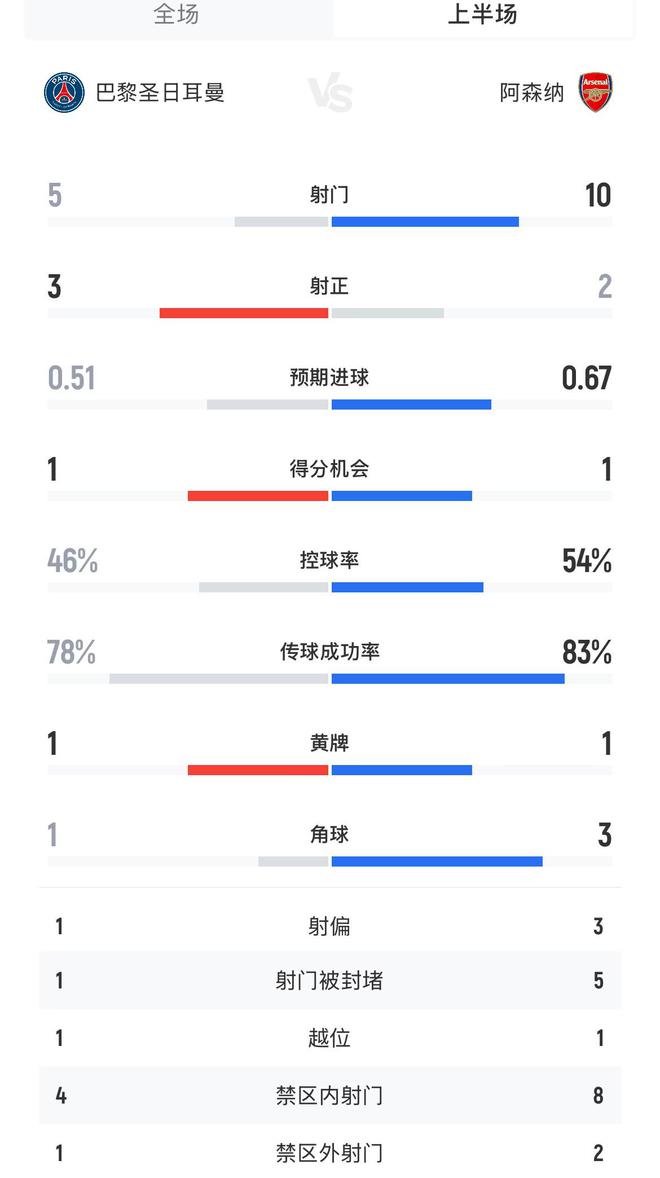 阿森納半場(chǎng)10射2正,巴黎5射3正,預(yù)期進(jìn)球阿森納0.67、巴黎0.51。