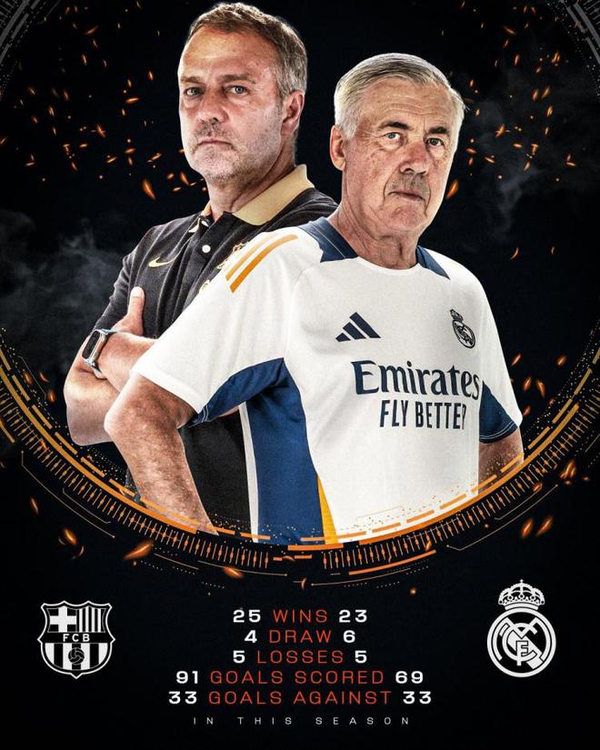 本賽季西甲戰(zhàn)績,巴薩34場25勝4平5負(fù),進(jìn)91球丟33球,積79分排名榜首,皇馬34場23勝6平5負(fù),進(jìn)69球丟33球,積75分暫列第二。