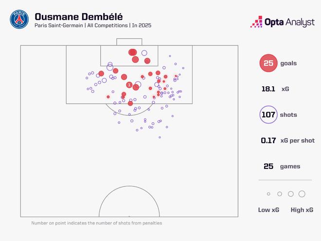 為了打進這25個進球,奧斯曼-登貝萊一共進行了107次射門的嘗試,總計預(yù)期進球值為18.1,平均每次射門的預(yù)期進球值為0.17。