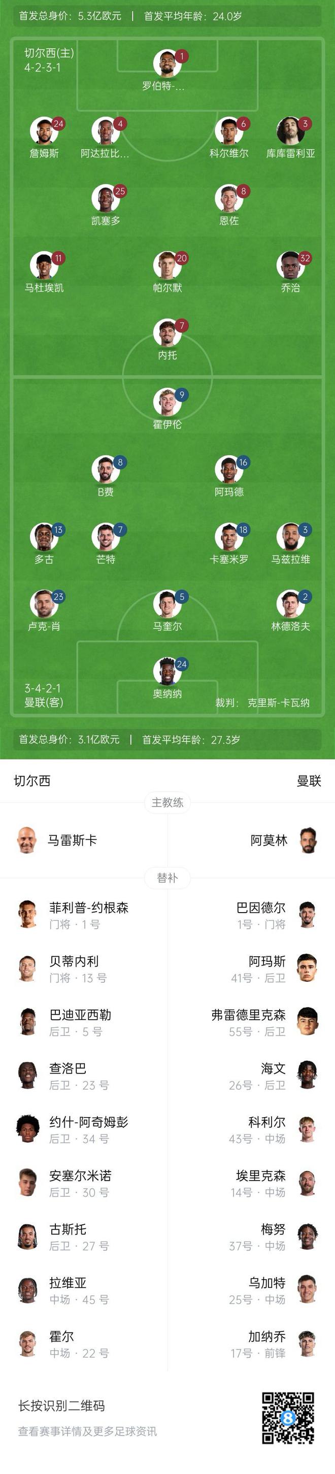 切爾西vs曼聯(lián)首發(fā):B費(fèi)、阿瑪?shù)隆⒚⑻叵劝l(fā),帕爾默、恩佐出戰(zhàn)
