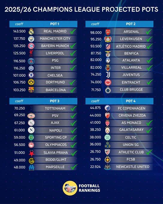 目前,下賽季歐冠36強已確定24席。