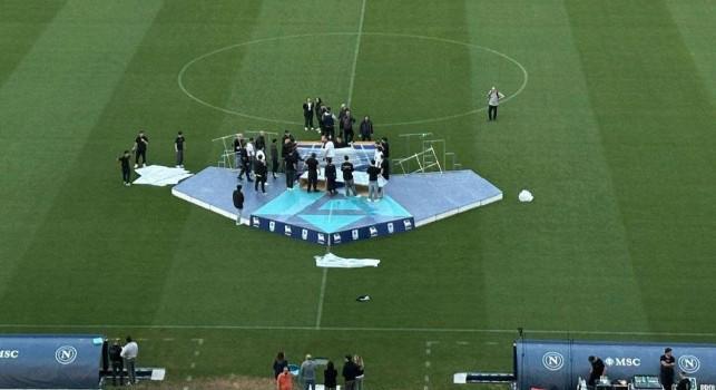 根據(jù)Calcionapoli24所報(bào)道的圖片顯示,不久前,那不勒斯在馬拉多納球場(chǎng)內(nèi)進(jìn)行了奪冠頒獎(jiǎng)儀式的彩排,舞臺(tái)布景的各個(gè)部分陸陸續(xù)續(xù)被運(yùn)送到體育場(chǎng)內(nèi)。