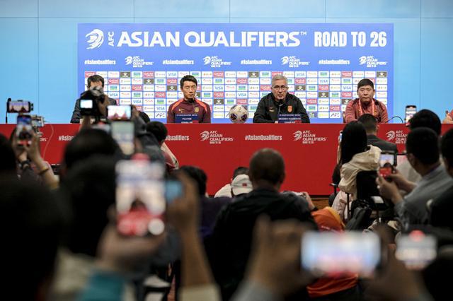 照片,杭州,2025年3月24日 3月24日,中國隊(duì)主教練伊萬科維奇(后右二)、球員李磊(后左二)在新聞發(fā)布會上。 當(dāng)日,中國國家男子足球隊(duì)在浙江杭州舉行新聞發(fā)布會并進(jìn)行賽前訓(xùn)練。中國隊(duì)將于25日在2026美加墨世界杯亞洲區(qū)預(yù)選賽18強(qiáng)賽C組第八輪比賽中主場對陣澳大利亞隊(duì)。 記者 江漢 攝