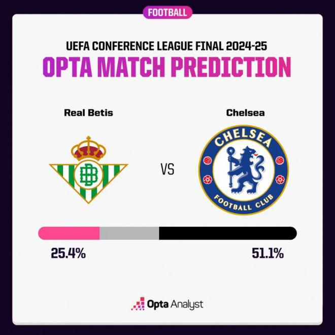 opta超算預(yù)測歐協(xié)聯(lián)決賽:切爾西90分鐘贏球51.1%,貝蒂斯25.4%