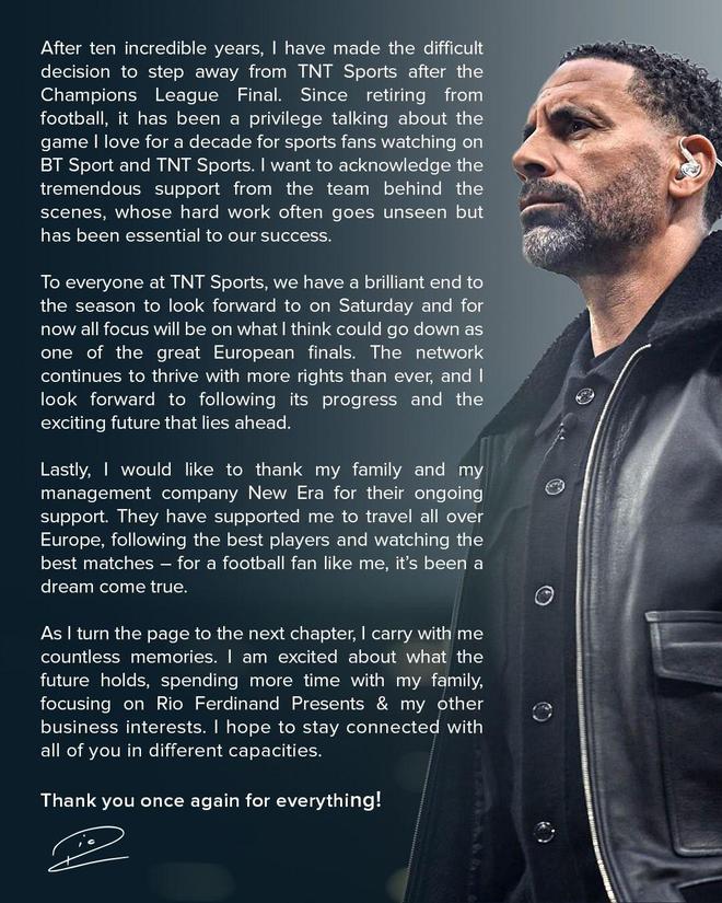 北京時間5月28日英超日報宣報,前曼聯(lián)球員里奧-費迪南德在社媒宣布,歐冠決賽后將離開從業(yè)十年的TNT體育評論員一職。