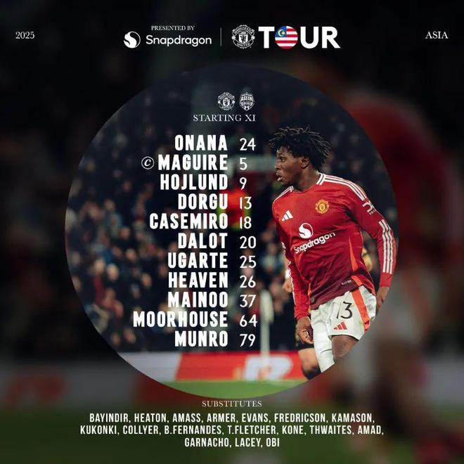 曼聯(lián)首發(fā):奧納納,馬奎爾(C),霍伊倫,多爾古,卡塞米羅,達洛特,烏加特,海文,梅努,摩爾豪斯,蒙羅;