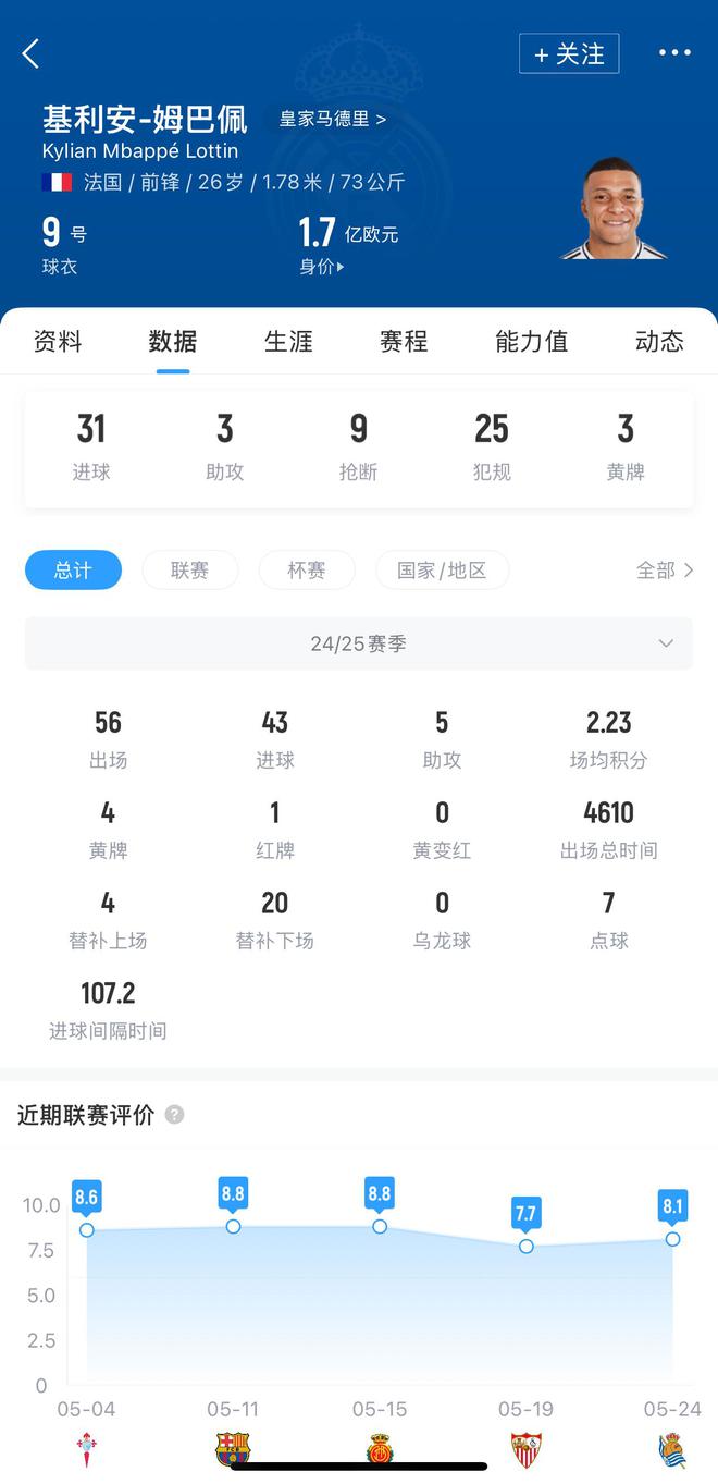 姆巴佩榮獲皇家馬德里2024/25賽季五星球員獎。這位前鋒在俱樂部度過了驚艷的首個(gè)賽季后獲此殊榮。他在56場比賽中攻入43球,是球隊(duì)贏得洲際杯和歐洲超級杯的關(guān)鍵人物。此外,他以31粒進(jìn)球成為賽季西甲聯(lián)賽最佳射手,捧得皮奇奇獎和歐洲金靴獎。