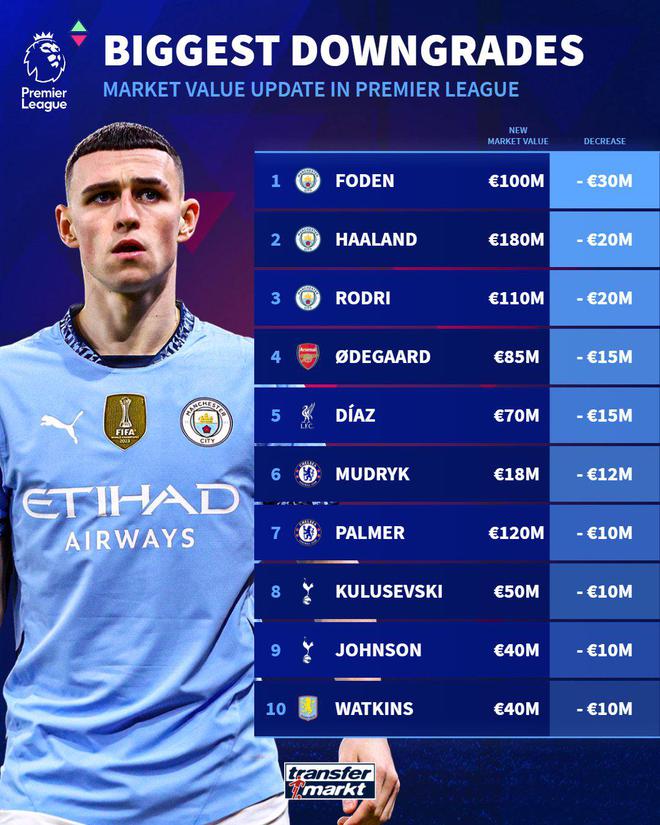 德轉英超身價下跌榜出爐!曼城3人在列,福登下跌3000萬領跑