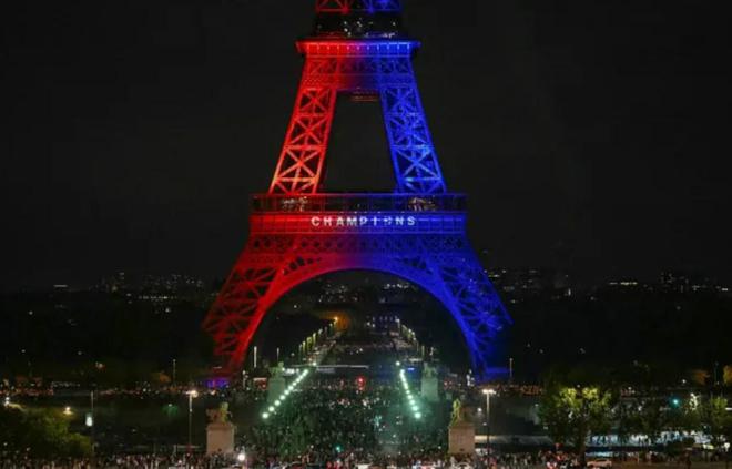 巴黎圣日耳曼奪冠后,埃菲爾鐵塔也點(diǎn)亮了紅藍(lán)燈光