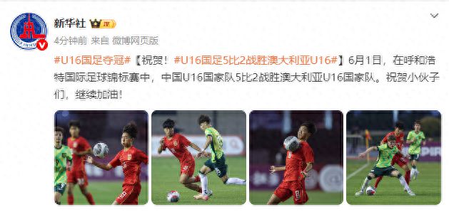 6月1日國足日報宣報,在呼和浩特國際足球錦標(biāo)賽中,中國U16國家隊5比2戰(zhàn)勝澳大利亞U16國家隊。祝賀小伙子們,繼續(xù)加油! ???