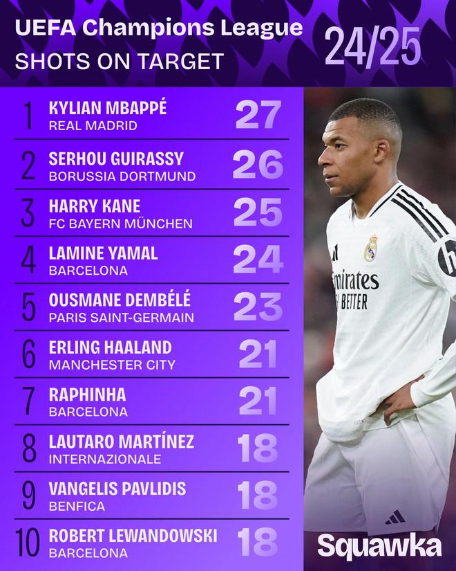 2024-25賽季歐冠聯(lián)賽射正次數(shù)最多前十名