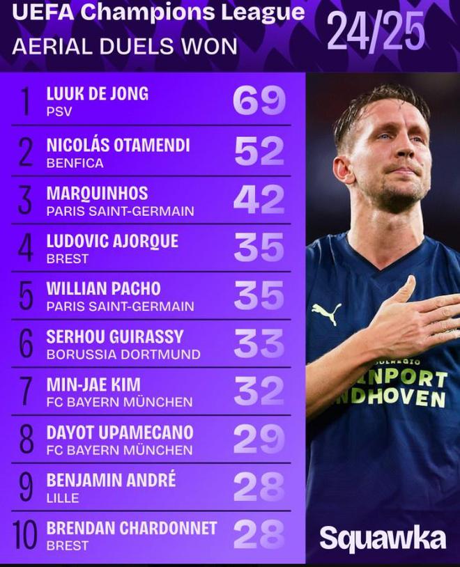 2024-25賽季歐冠高空球爭(zhēng)搶榜:盧克-德容69次居首,奧塔門迪次之