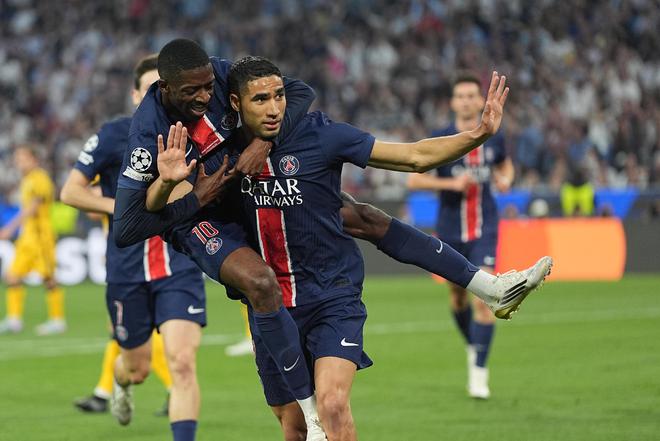 當(dāng)?shù)貢r間2025年5月31日,巴黎圣日耳曼隊阿什拉夫(前右)在比賽中慶祝進球。圖片來源:記者 彭子洋 攝