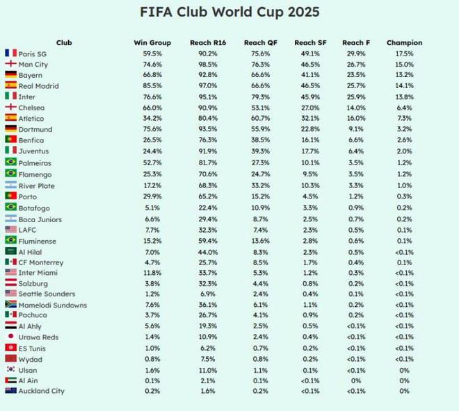 媒體預(yù)測世俱杯奪冠概率:巴黎17.5%最高,曼城15%&皇馬14.1%