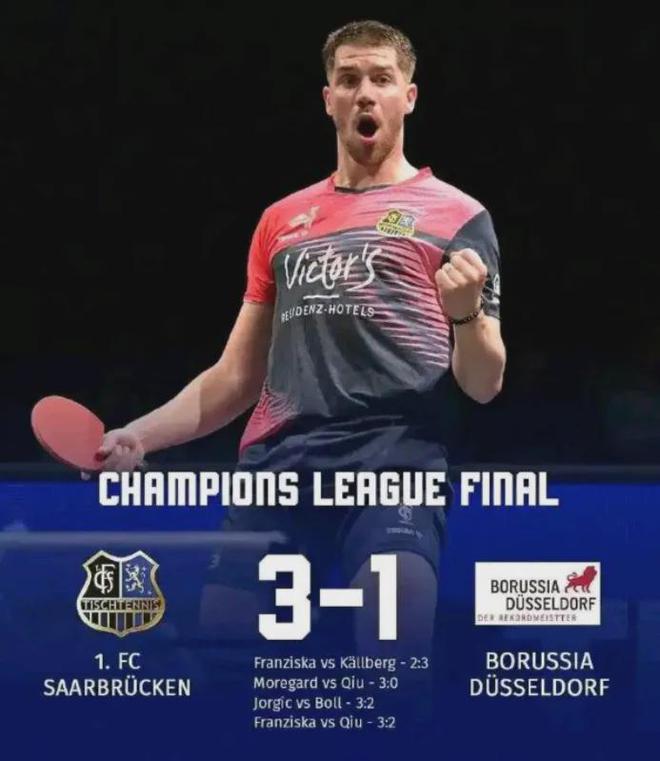 就在樊振東被官宣加盟薩爾布呂肯俱樂(lè)部沒(méi)多久,薩爾布呂肯俱樂(lè)部就在歐冠的賽場(chǎng)上大放異彩了。在歐冠決賽上,薩爾布呂肯和杜塞爾多夫相遇,經(jīng)過(guò)一番激戰(zhàn),坐擁莫雷加德、弗朗西斯卡等球星的薩爾布呂肯以3-1的比分擊敗了老將波爾帶領(lǐng)的杜塞爾多夫。算上這一次的奪冠,薩爾布呂肯豪取歐冠三連冠。在這個(gè)節(jié)骨眼上達(dá)成這樣的成就,薩爾布呂肯也算是雙喜臨門(mén)了。