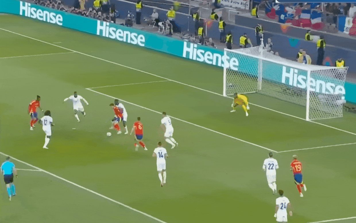 第22分鐘,亞馬爾發(fā)動(dòng)進(jìn)攻,禁區(qū)內(nèi)形成混亂,尼科威廉斯勁射破門,1:0!西班牙率先打破僵局。僅僅三分鐘后,法國隊(duì)防守出現(xiàn)大意,奧亞薩瓦爾送出精準(zhǔn)過頂球,梅里諾抽射再度破門,2:0! 兩球落后的法國隊(duì),逐漸加強(qiáng)了進(jìn)攻端的投入,但是烏奈西蒙的狀態(tài)太過出色,高接抵擋多次令法國隊(duì)的射門無功而返。