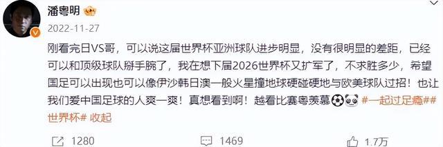 2022年11月27日晚,潘粵明發(fā)文聊世界杯觀后感,他寫道:“剛看完日VS哥,可以說(shuō)這屆世界杯亞洲球隊(duì)進(jìn)步明顯,沒(méi)有很明顯的差距,已經(jīng)可以和頂級(jí)球隊(duì)掰手腕了?!?/p>