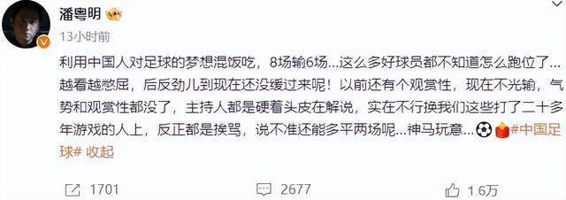 這并非是潘粵明第一次發(fā)文談國(guó)足,3月26日晚,潘粵明就曾發(fā)文談“國(guó)足8場(chǎng)6敗”,引發(fā)網(wǎng)友熱議,相關(guān)話題詞沖上熱搜榜。