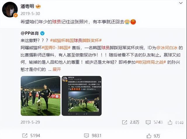 潘粵明也忍不住怒斥了韓國(guó)球員的行為:“希望咱們年少的球員記住這張照片,有本事就還回去?!?/p>