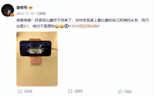 2023年11月16日,他曬出觀看國(guó)足與泰國(guó)隊(duì)比賽的照片,為中國(guó)足球加油。