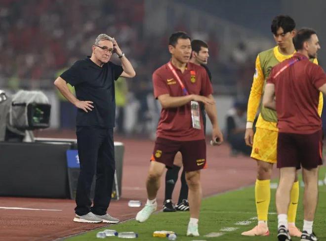 ↑中國隊(duì)主教練伊萬科維奇(左一)在場邊。發(fā)