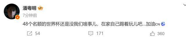 賽后,男星潘粵明也發(fā)聲:48個(gè)名額的世界杯還是沒我們啥事兒,在家自己踢著玩兒吧……加油中國足球。