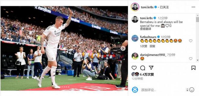 克羅斯在社交媒體上曬出登場時的照片,并配文:“伯納烏對我來說是特別的,永遠如此。”