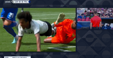 第32分鐘,德國長傳反擊,阿德耶米殺入禁區(qū),邁尼昂出擊試圖撲救,阿德耶米倒地!主裁第一時間判罰點球,VAR介入,主裁觀看視頻回放之后認定阿德耶米假摔,取消點球并黃牌警告阿德耶米。