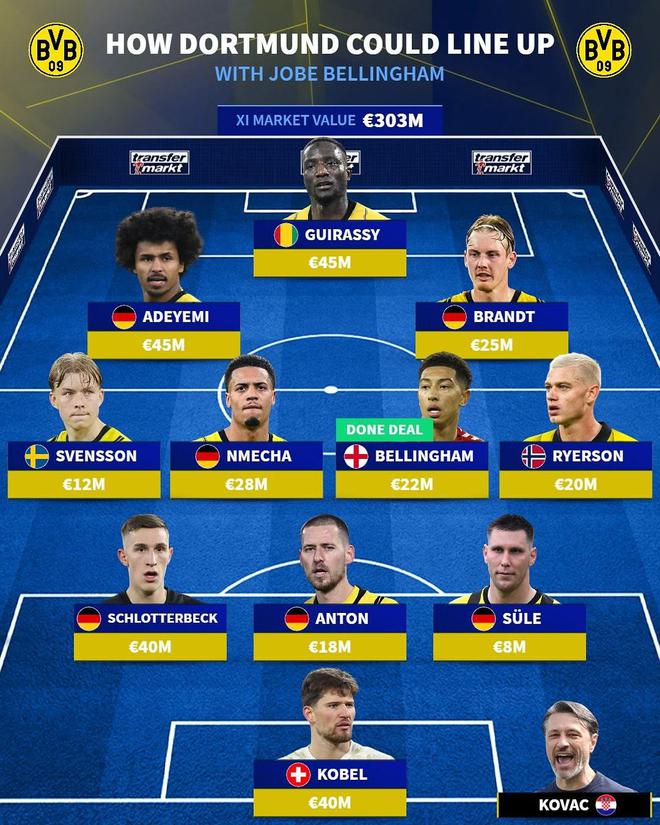 北京時間6月10日德甲日報宣報,隨著喬布-貝林厄姆正式加盟多特蒙德,德國轉會市場預測了他加入后的多特蒙德潛在首發(fā)陣容,陣中11名球員的總身價高達3.03億歐元。