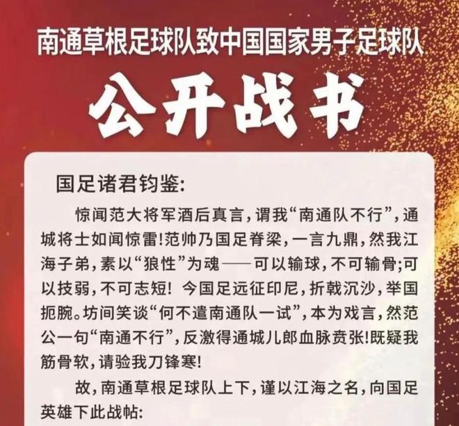 網(wǎng)傳南通足球隊下戰(zhàn)書挑戰(zhàn)國足,南通足協(xié)辟謠:沒有這回事