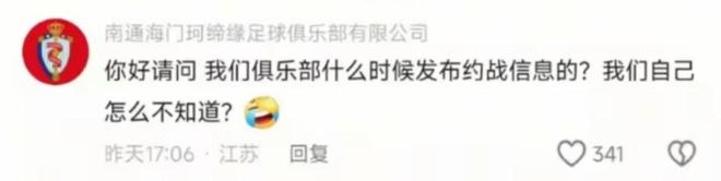 此外,還有自媒體稱,目前南通隊的主體海門珂締緣足球俱樂部將約戰(zhàn)國足,上游新聞記者就此事聯(lián)系了該俱樂部,但未得到回應。不過該俱樂部的官方賬號曾上網(wǎng)留言,明確否認此事?!拔覀兙銟凡渴裁磿r候發(fā)布約戰(zhàn)信息的?我們自己怎么不知道?”??