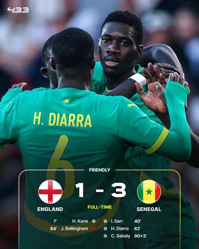 熱身賽,英格蘭1-3被塞內(nèi)加爾逆轉(zhuǎn)。凱恩首開紀(jì)錄,薩爾扳平,哈比卜-迪亞拉破門反超,貝林厄姆打進(jìn)一球,但是隊(duì)友手球犯規(guī)在先,薩巴利補(bǔ)時(shí)破門。
