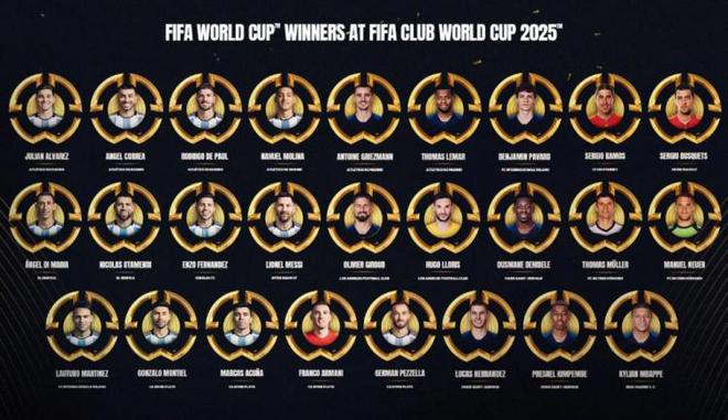 法國:格列茲曼(馬競)、勒馬爾(馬競)、帕瓦爾(國米)、吉魯(洛杉磯FC)、洛里(洛杉磯FC)、登貝萊(巴黎圣日耳曼)、盧卡斯(巴黎圣日耳曼)、金彭貝(巴黎圣日耳曼)、姆巴佩(皇馬)
