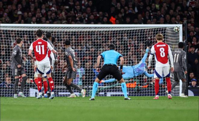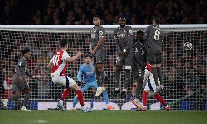 2024-25賽季歐冠1/4決賽首回合,阿森納主場對陣皇家馬德里。第70分鐘,賴斯主罰的任意球直竄球門的十分角,這是一記完美無解的任意球世界波,堪稱“貼郵票”式的任意球,即便當今足壇最優(yōu)秀的門將庫爾圖瓦舒展雙臂,也是鞭長莫及!