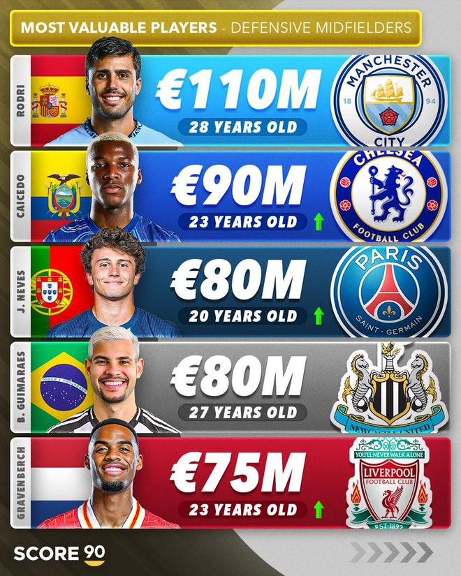 曼城中場羅德里以1.1億歐元位列榜首。切爾西的莫伊塞斯-凱塞多以9000萬歐元排名第二。巴黎圣日耳曼的若昂-內維斯和紐卡斯爾中場吉馬良斯同為8000萬歐元,并列第三。利物浦的赫拉芬貝赫則以7500萬歐元位列第五。