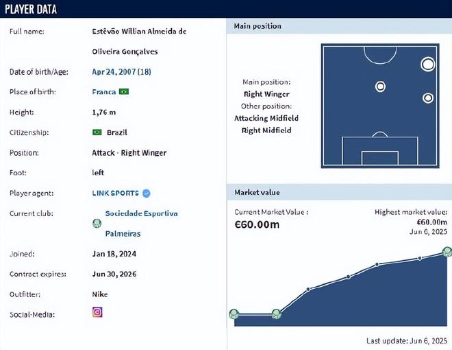 在最新一期的德轉(zhuǎn)身價(jià)榜上,埃斯特旺已經(jīng)達(dá)到6000萬(wàn)歐元,追平了恩德里克2024年所創(chuàng)造的巴甲球員身價(jià)紀(jì)錄。