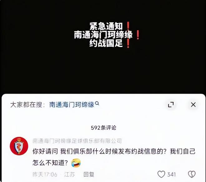 偏偏在網(wǎng)友越刷越帶節(jié)奏的時(shí)候,南通那邊卻很冷靜,俱樂部官方賬號(hào)留言“我們什么時(shí)候發(fā)布約戰(zhàn)信息的?我們自己怎么不知道?”