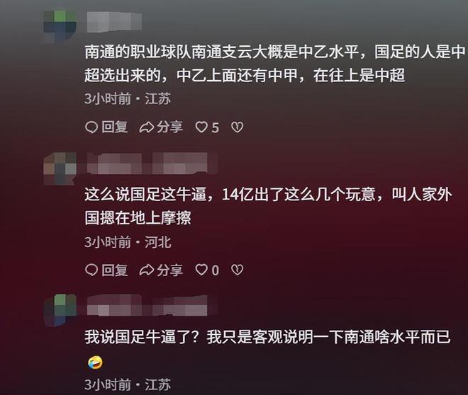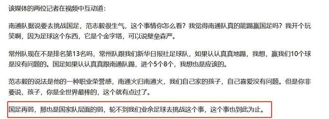 一人打了個(gè)比方,說常州隊(duì)要是真對(duì)上報(bào)社業(yè)余球隊(duì),認(rèn)真踢贏報(bào)社10個(gè)球都不嫌多,那國足認(rèn)真踢南通,進(jìn)個(gè)五六個(gè)也是常規(guī)操作,并且直言表示,國足在弱也是國家隊(duì)層面的弱,輪不到業(yè)余足球去挑戰(zhàn),這事兒也到此為止。